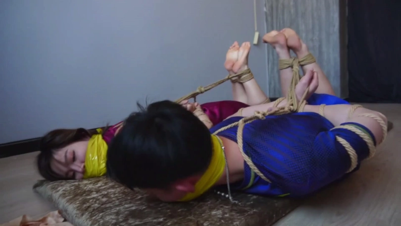 片段4:帅哥康行与女友小琛被歹人入室劫持后先用原味内裤塞嘴,二人互相解绳子被发现,歹人生气将他们捆成驷马并脱掉二人脚上穿的原味锦纶丝袜交换塞入情侣二人口中,并用胶布绷带一圈圈将他们嘴封严实。