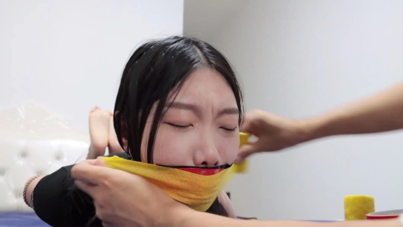 片段6:美女琪梦和表弟被入室劫匪捆堵折磨,还被胶布绷带一圈圈缠绕封嘴。