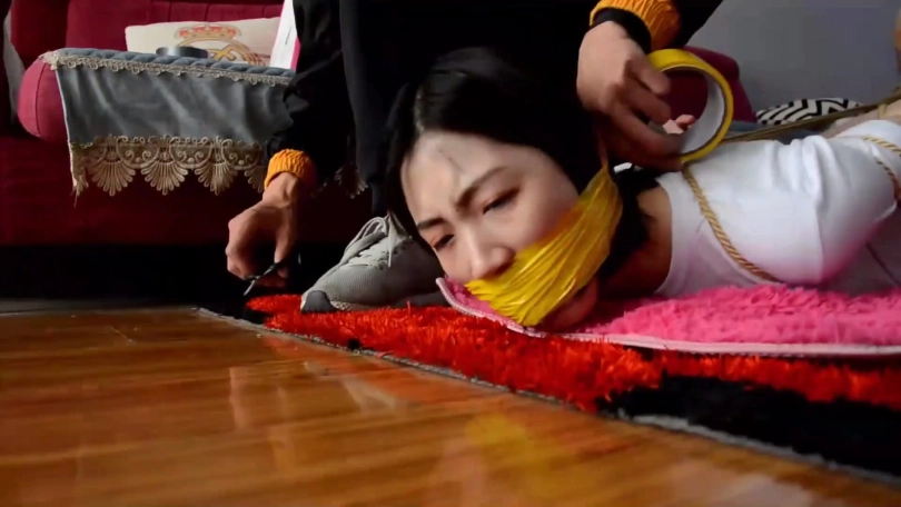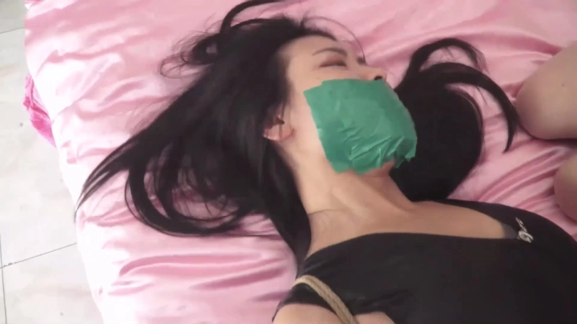 片段9:模特王仟雅被一双原味脏黑色锦纶丝袜塞满嘴,嘴外被紫色电工胶布封住,并被黄色静电胶带与黑色自粘绷带缠绕封嘴。