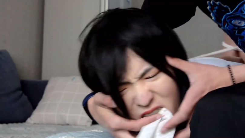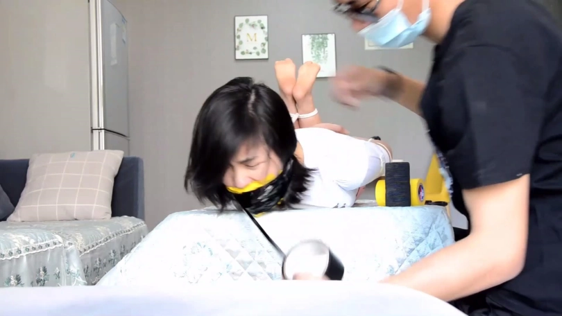 片段8:模特吴晗被一条原味黑色脏内裤塞满嘴,嘴外被绿色宽电工胶布封住,并被黄色静电胶带与紫色自粘绷带缠绕封嘴。