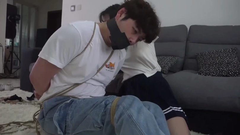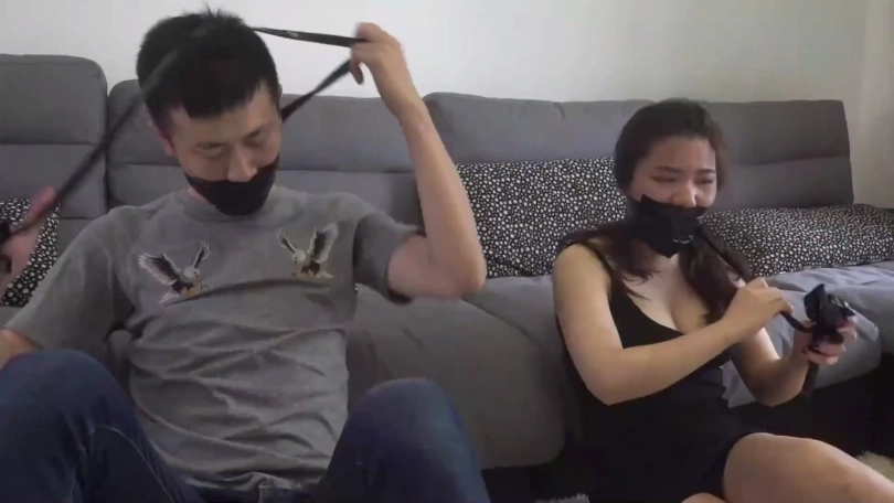 (八)下班回家和自己老公一起被捆堵折磨的美女若冰,最终挣脱束缚解除眼睛外和嘴外封堵,小两口互相安慰对方平安就好,同时准备休息休息报案去抓坏人。
