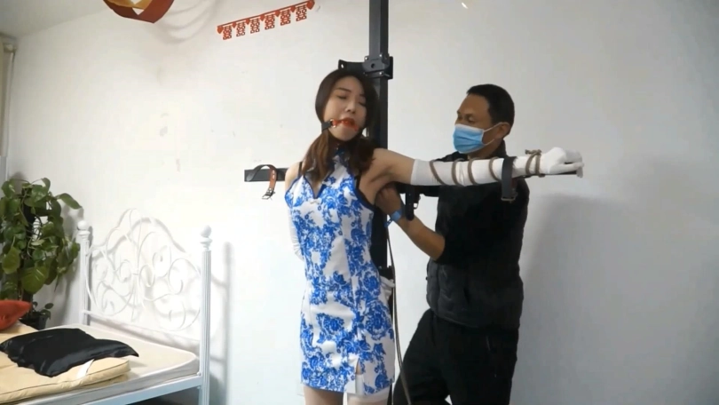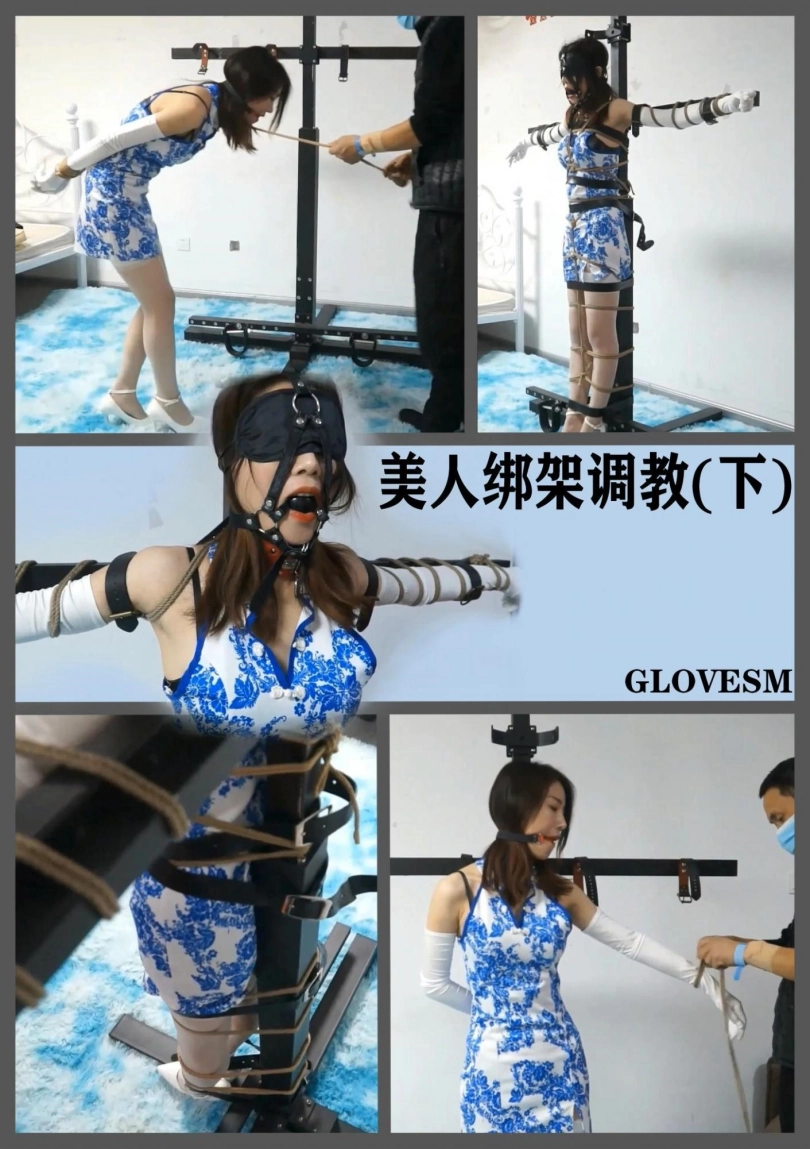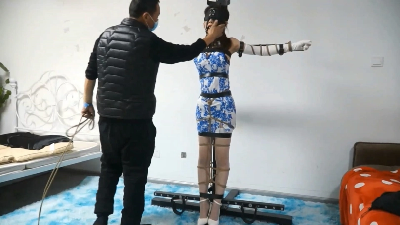 下集紧缚感继续升级,绳子和皮带一齐用上,全身只有双手还能挣扎。戴上眼罩和马具式口球后只能小姐姐只能唔唔叫,口水不断。