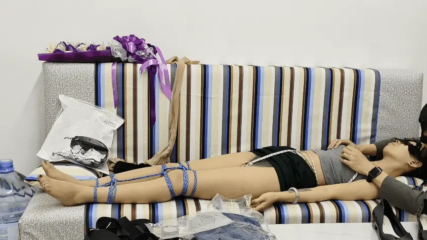 › 【睡美脚】【诺米家中自缚遭劫】自缚面罩开档肉丝袜ZWZDB捂晕抚摸翻白眼手铐