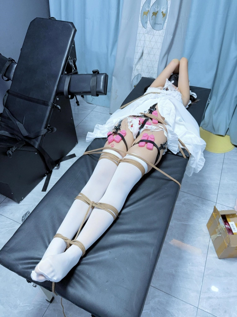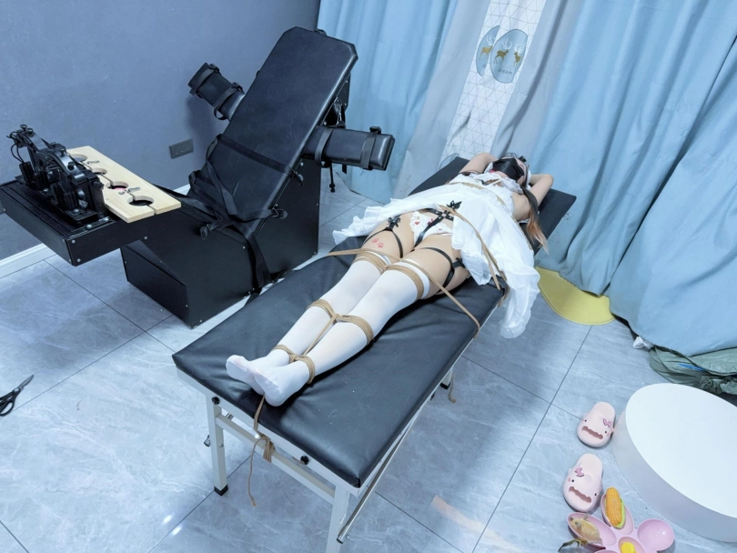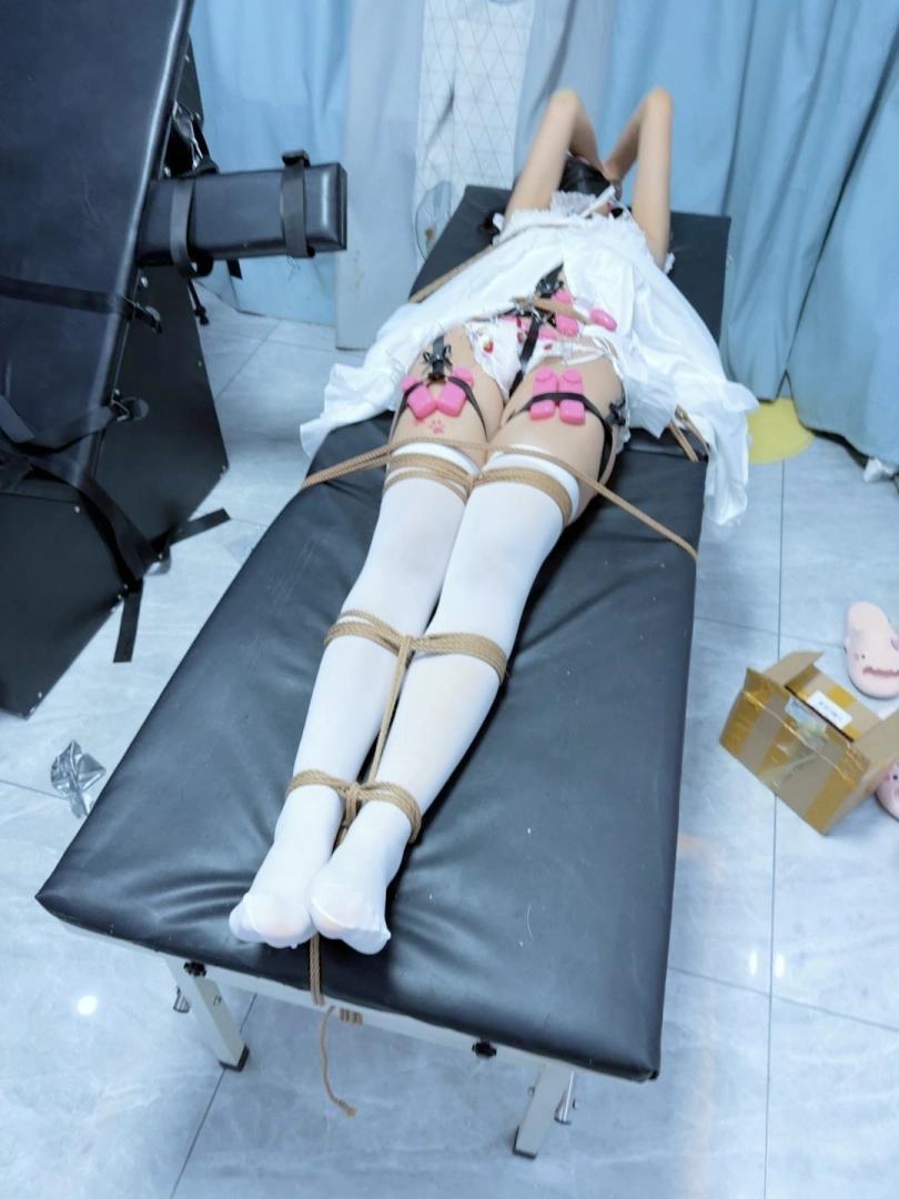 道具:口罩内带了大口径口球,平躺式刑床、全身多道绳子束缚、大量粉蛋、八爪鱼按摩仪、全身TK