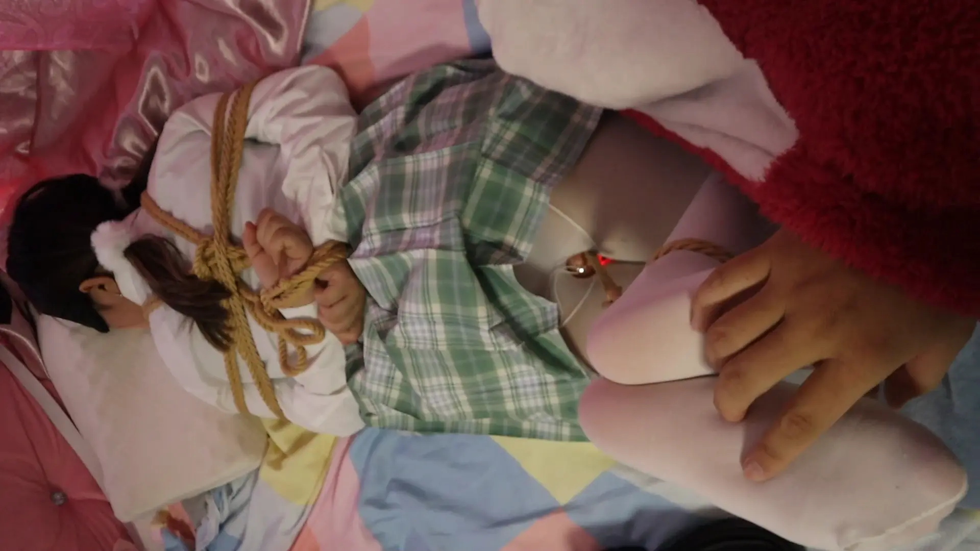 【荷仙少女】绿JK白丝少女奴,拉动股绳嗯嗯的叫,驷马绑,指令+舔+鞭打+小玩具振 股绳慢慢拉动 胶带封嘴TK挣扎,边痛苦求饶边爽的呻吟始终没停下来