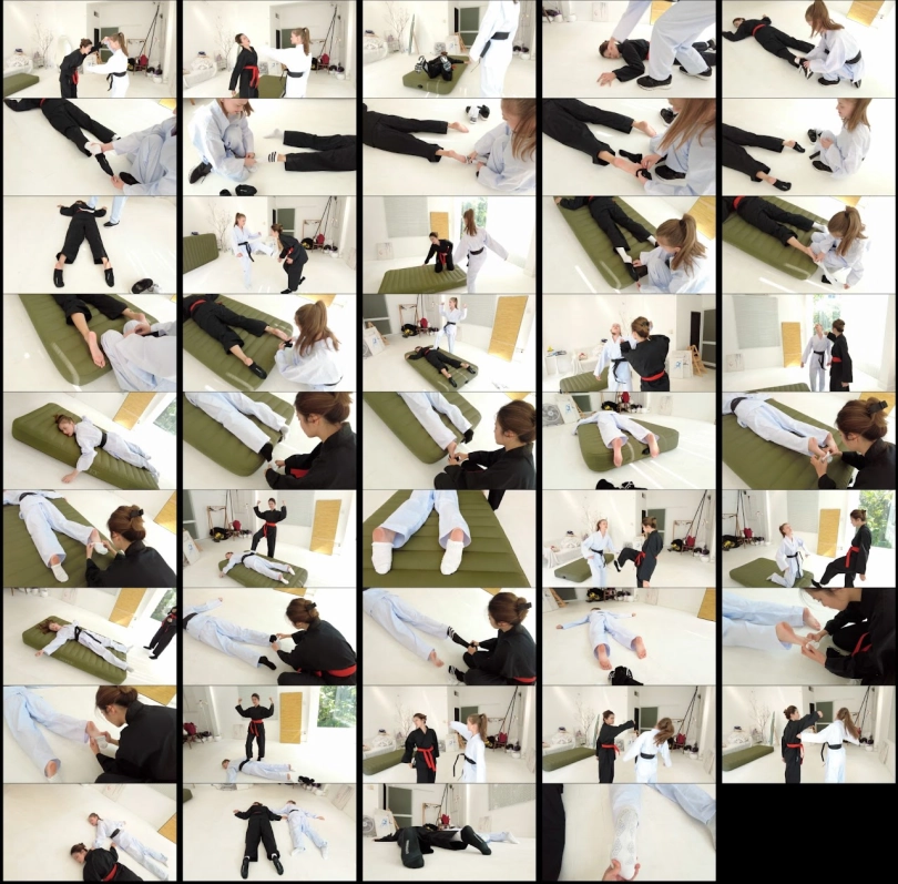Rose (Black Gi) fought against Emma. To win a match, the winner must knock her opponent out then remove both of the loser`s socks and then put the small sock on halfway.