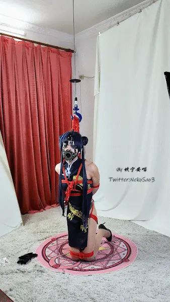 服装是最近比较火的碧蓝档案中华风旗袍萝莉妃咲,只能说这个角色完全长在我的XP上了~后手直臂+上半身悬吊+眼罩蒙眼+马具口枷强制开口+训练器强高,手和马具口枷相连,强迫抬头~