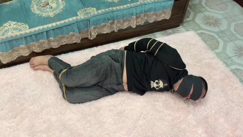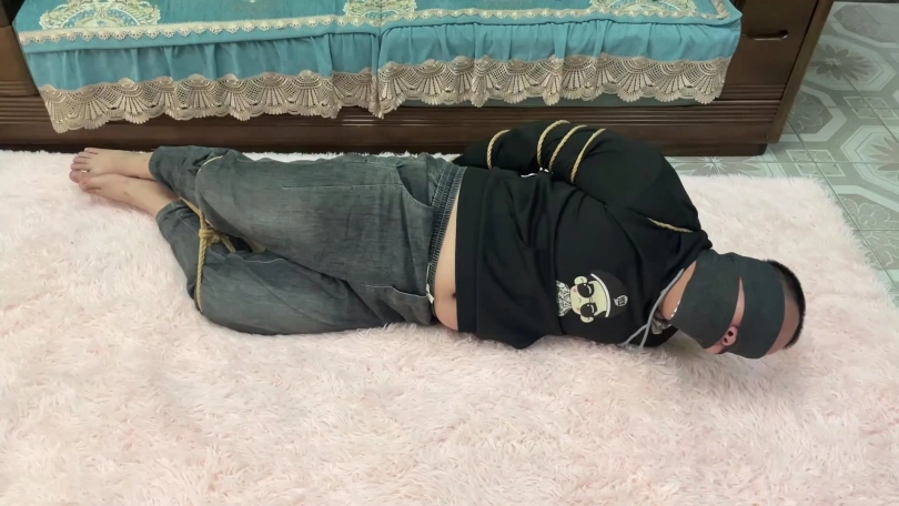 胡子哥在黑暗中呜呜闷哼扭动身体挣扎着,但是始终无济于事,最终只能减小挣扎幅度等自己女友回来给自己解开。