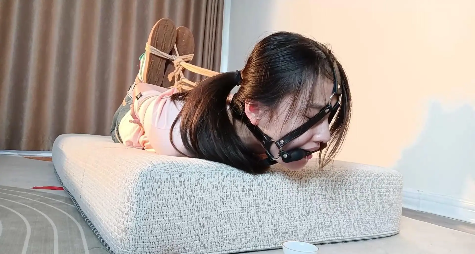 1小时驷马放置,头一直连到脚上想想肯定很爽,口枷戴着小姐姐一直有口水流下来,中途还有一段TK挠痒后来把脚上的绳子连到手腕处应该会让头舒服点,一小时口水都没有流满一碗。
