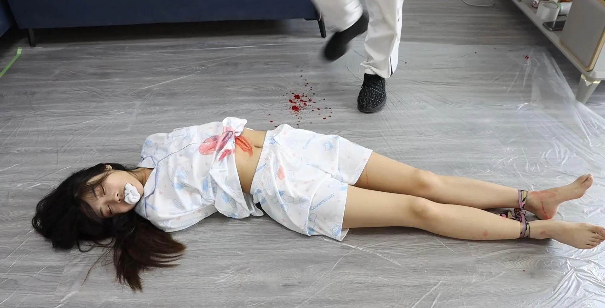 此时躺在地上的尸体姿势(两手被反绑在身后,脚脖被绑,嘴被堵着。上衣由于拖拽露出一小部分腹部及肚子上的刀口)留 2 分钟。