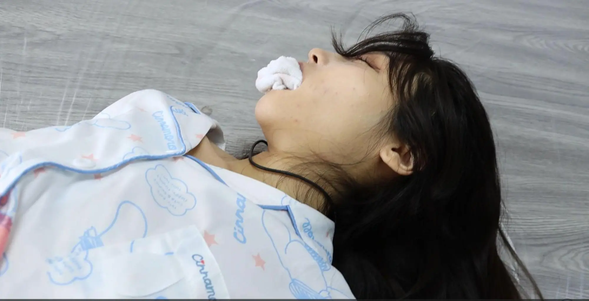 后来小偷把女子尸体放到地面上。趴在地上。就有了开头一幕手腕丝巾反绑在身后,脚脖被丝巾绑住,嘴被毛巾堵住。再留 2 分钟 【第一段到此处 17 分钟】