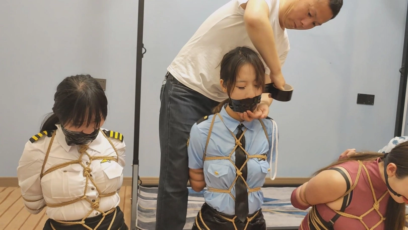 四个美女经过一阵Tj,被换上各种制服准备出售,先给老大过目,然后关押起来准备运出。