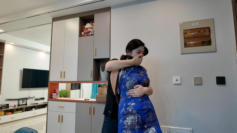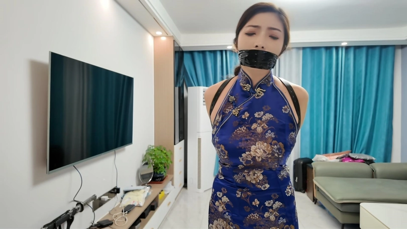 模特佳佳在家换上黑丝,蓝色旗袍准备出席一个活动,不料被早已藏在家中的歹徒袭击捂晕,捆绑到椅子上各种折磨,最后被捆绑关到衣柜里面,佳佳费力挣脱逃出去,又被歹徒抓回侵犯