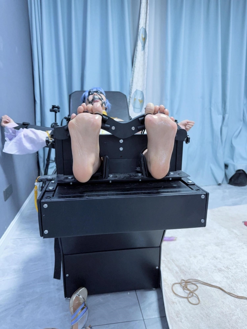 1.佩戴金属马具口球、胶带蒙眼固定在重刑床上,每一根脚趾都固定好,并涂油进行TK,手指、头皮按摩器、八爪按摩仪都要兼顾~用手指掰开脚趾狠狠挠嫩足底真是太爽滑了!
