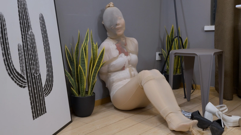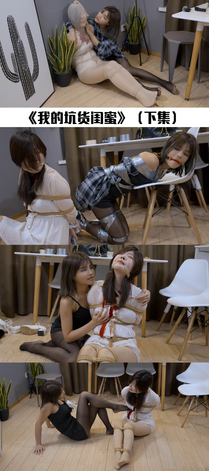 绑匪走之前留了一把剪刀给她俩,在争执谁先解开后,闺蜜选择帮助女主解开,女主被解开了之后,不仅没有解开闺蜜,反而加了一道股绳和胸缚,最后加上一层丝袜睡袋惩罚她。