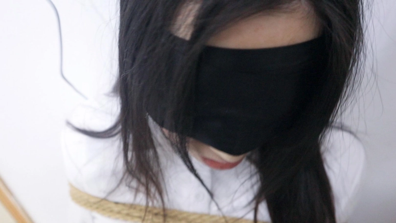 穿着皮鞋的白棉袜双脚被固定在床头柜的两个柱子上剥夺感官