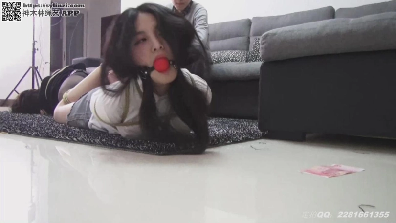 两个美女被驷马捆绑放在地毯上,在她们的前方放着一张百元大钞,土豪说,谁先爬到就是谁的,于是两个女孩拼命向前爬,爬到以后,被土豪又拉回到起点,开始第二轮赛爬。玩了一会,土豪又让两个女孩往反方向爬行,这个游戏叫做‘拔河`
