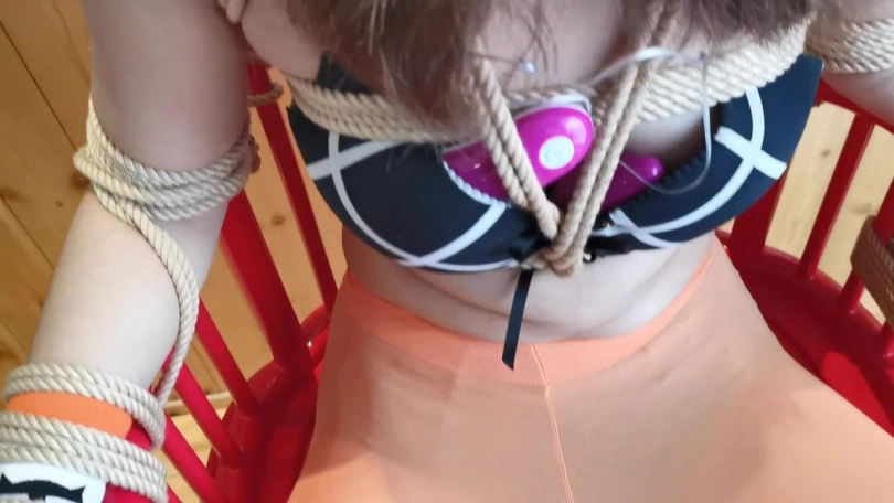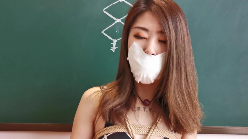 从外面回来后让她换了双颜色很性感的连裤袜,只穿内衣。先用一双棉袜套住她的双手,再用胶带缠绕固定住,防止她用手部力量将袜子蹭掉。用绳子将她的胸部紧紧的捆住,让她坐在椅子上,双腿分开分别绑在两个椅子角。双手也分别绑在椅子上,让她无法从椅子上挣脱。接下来拿来她穿了天天的肉丝塞进她的嘴里,在塞嘴时瑾萱明显皱起了眉头。自己穿过的袜子还挺嫌弃。用医用胶布封住她的嘴巴,防止她把袜子吐出来。再用绷带一圈圈的缠住她的嘴巴。接下来用一双连裤袜套住她的头部(当然也是穿了一天)。在脑后打了个结。可能你会问为什么不把袜尖部分在她的鼻子处打结,因为鼻子处我还有其他用处。拿出一卷电工胶带再次缠绕固定她的嘴部,并在面部“X”型交叉缠绕进一步固定面部的连裤袜。这时瑾萱的声音已经限制了大部分,但这次实验并没有结束。用一个皮质头[不可描述]住她的头部,绑好后面的绳带,这个头套作用是束缚头部和嘴部,只能露出眼部和鼻子。此时的瑾萱已经明显不出现反抗情绪,不断扭动挣扎。别急,我在给你加点料。拿出她穿了一天的棉袜折叠好放在她的脸部,味道比较弄的袜尖部分正好对着她的鼻子处。外面再给她戴上一个超大棉口罩。这样瑾萱几乎发布出声音,只有轻微的“呜呜”声。而且这口罩也起到了限制她呼吸的作用,瑾萱每次都要快速尽可能的呼吸,但每次呼吸到空气的同时,放在鼻子处袜子的味道也一同被她吸入。她挣扎的幅度开始变大,看来确实是有些不舒服了,那我就帮你舒服下吧。拿出快感棒,对准她的禁区就是一顿强烈刺激。瑾萱的动作开始由挣扎变成颤抖,她努力的想和我说着什么,但只能发出微弱的“呜呜”声,咱也不知道她要和我说啥,姑且理解为别停继续的意思吧。在不断的刺激下她的禁区终于。。。