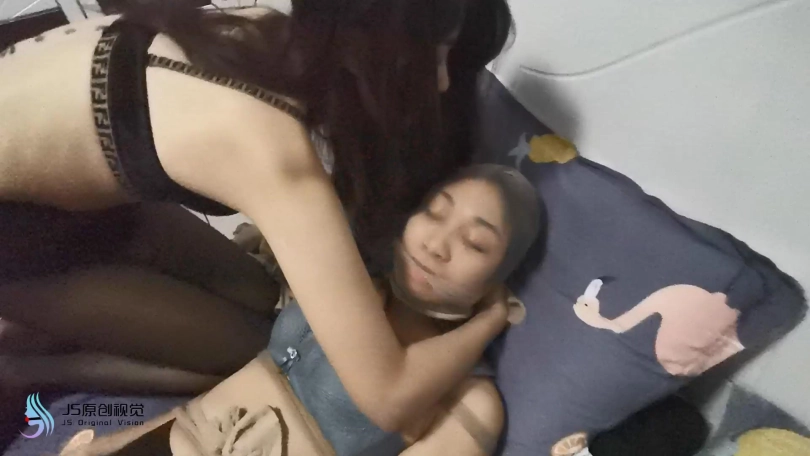 两个女孩是捆绑爱好者,刷手机看到丝袜捆绑不错,觉得尝试下。瑾萱用丝袜将若灵捆绑起来,用丝袜套头。用脚不断的挑逗着,骑在若灵身上将[不可描述]棒放在两人敏感地方中间刺激着。真到彼此达到顶点。