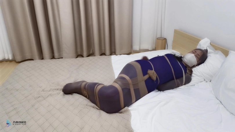 让她穿着紫色的丝袜连体衣,用丝袜把她手脚捆绑起来。再用丝袜套住她的双腿和胳膊。嘴巴里也塞进了丝袜,叫不出声。外面在带上口罩,丝袜套头。搂着这样一个被束缚起来的美女睡觉,真是一种不错的感觉。