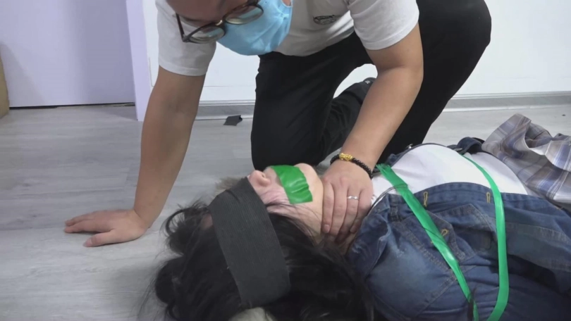 口罩男看差不多了,松开手,妹妹猛的用鼻子使劲呼吸,剧烈的呼吸,使妹妹的胸部剧烈起伏起来,让口罩男觉得妹妹真是个漂亮胚子。想好好戏弄她一下,口罩男就脱了妹妹的鞋开始挠脚心。