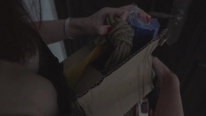 推出去了一个盒子,说保险起见让姐姐绑好自己才能进来,姐姐打开了盒子,发现是绳子和胶布。