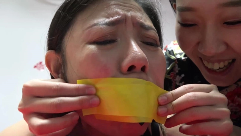 李然得罪琪琪,被琪琪入室报复,试图逃跑以后惩罚升级,驷马捆绑,原味短丝,黑丝塞嘴,胶布封嘴以后用宽绷带蒙住半边脸,之后再戴上眼罩,很完美的老狼风