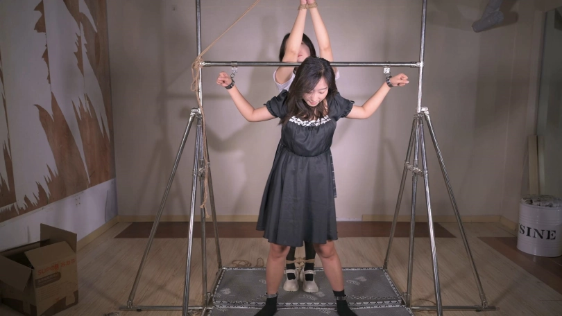 长腿清纯小妹初次体验铁架镣铐,可能是链子留的太短了,有点硌手,但能让她最大伸展。然后让她去铐姐姐,就是这个决定埋下了她们逃脱的隐患,她学会了这种铐子的解锁方法,铐的过程中弄掉了一把小钥匙,这是第二个隐患,当我把小妹双手吊绑的架子上的时候,我竟然系了一个活扣。当我捆好后,去抽了根烟,准备回来欣赏欣赏,让她们在架子上好好待一会的时候,出现了搞笑的一幕。