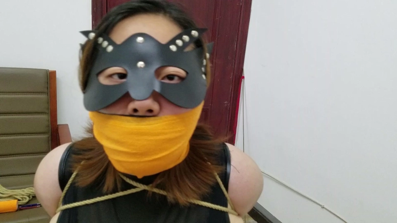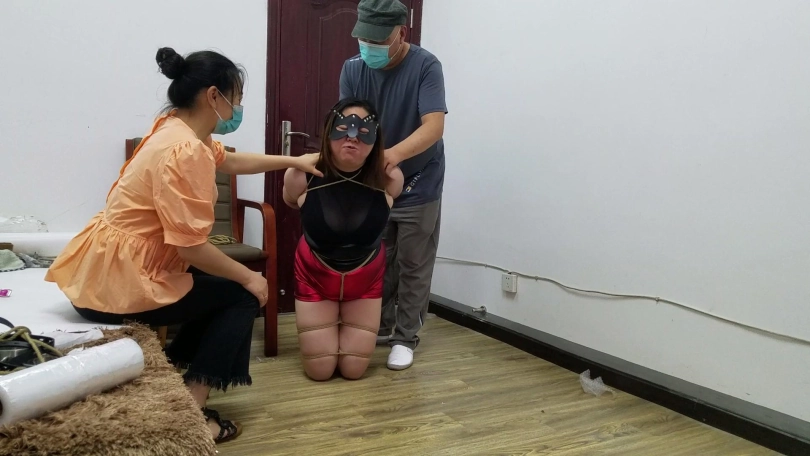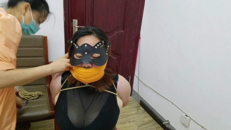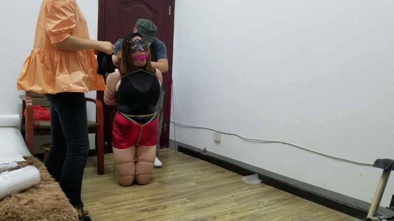 男女S将平时得罪过他们的一名中年胖女M上身五花大绑,双腿脚踝并拢捆绑多道,捆得严严实实,而后女S找来一双自己穿过没洗的黑色短丝袜塞入胖女M口中,再命男S脱下女M脚上高跟鞋,扒掉脚上穿的一双原味肉色短丝袜继续塞入女M嘴里,塞满四只短丝袜后女S用黑色宽胶布剪下5张封在女M嘴外,再用橙色弹力自粘绷带缠绕5圈,在离开前男S还将胖女M捆成驷马放置在地上。