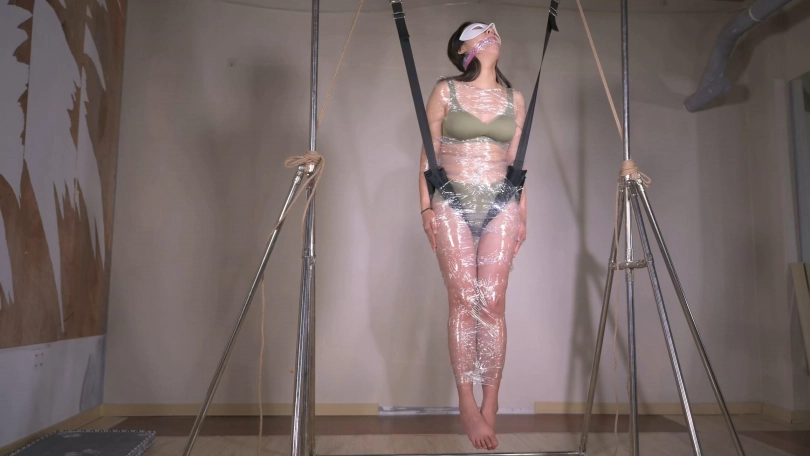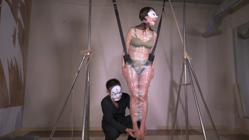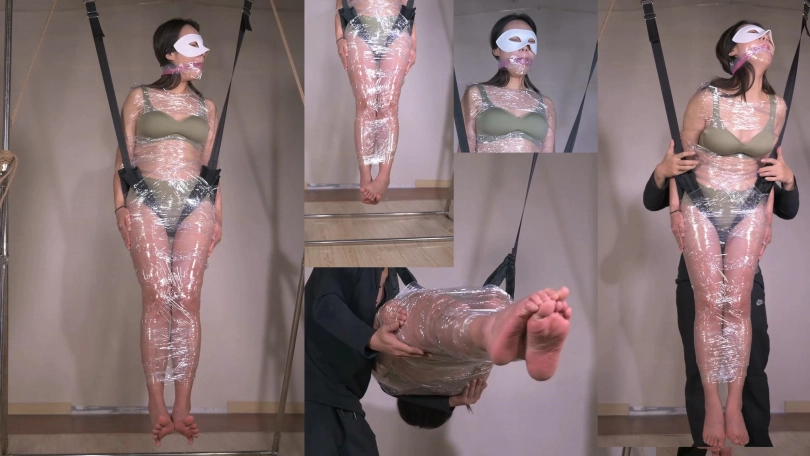 一直想尝试一下木乃伊包裹后把绳模悬吊起来,一时间也没有找到参照,本来想用四个吊点,后来还是抱着试一试的态度只用大腿根部两点来吊,没想到竟然得到出其不意的效果,绳模不但能保持住平衡,还能把她放平,TK时的挣扎也能维持平衡,绳模坚持的时间也比较长,一次非常成功的尝试。