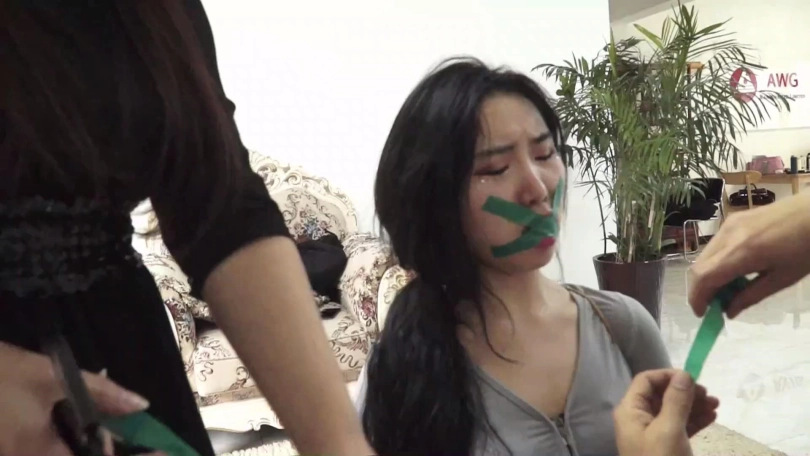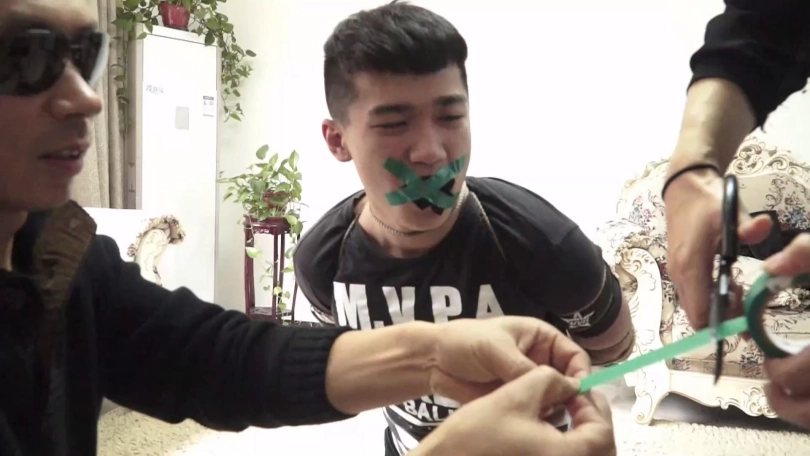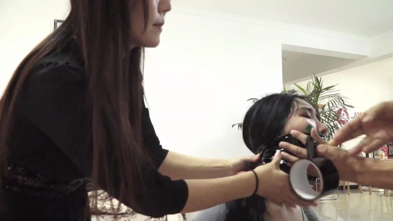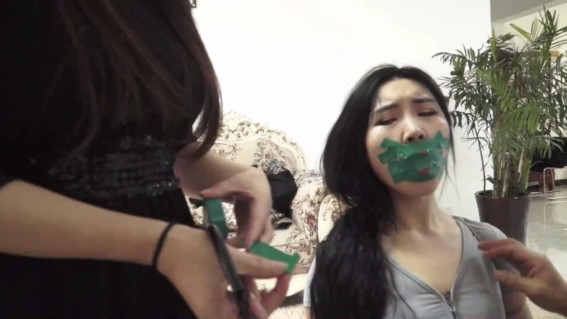 随后李然和锁哥拿绿色细胶带分别在吴晗和她男友嘴外缠绕,再用黑色宽胶带和紫色弹力自粘绷带缠绕多圈封严实,最后更是将他们捆成驷马。