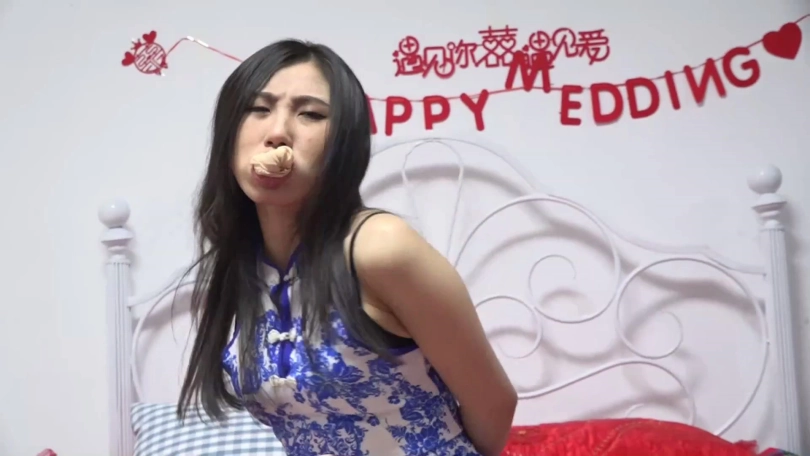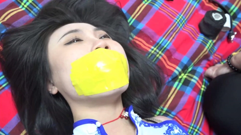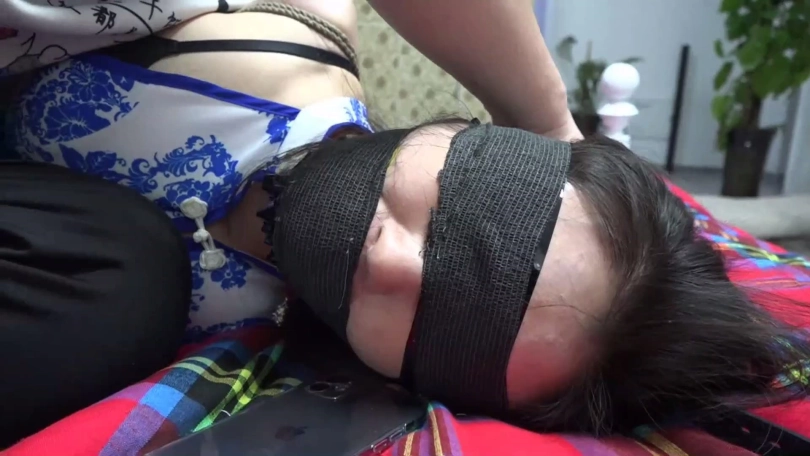 穿青花色旗袍的美女阿琳在家被劫匪劫持,劫匪拽出阿琳口中塞口球丢掉,将一双原味肉色短丝袜塞入阿琳口中后到阿琳卧室房间翻找财物。