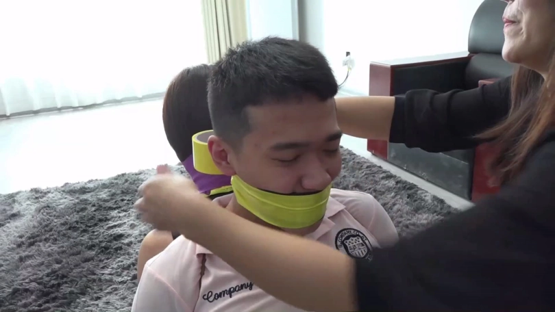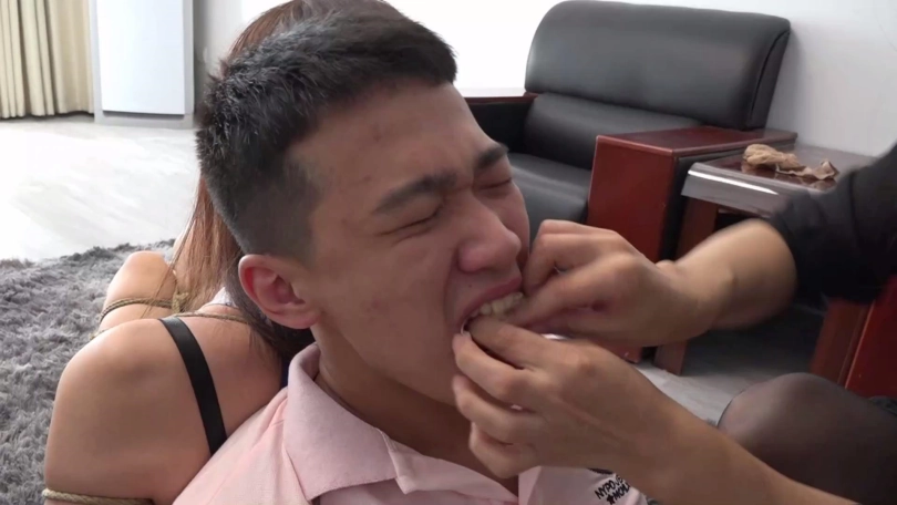 为了进一步羞辱这对情侣,李然决定直接脱掉他们脚上现在穿的原味袜子分别塞入对方口中,于是阿琳男友脚上穿的黑色锦纶丝袜被扒掉塞入阿琳口中,阿琳脚上穿的肉丝锦纶丝袜被扒掉塞入阿琳男友口中,令情侣二人痛苦万分,而后李然拿黑色胶布封在二人嘴外,用黄色胶带、紫色自粘绷带缠绕多圈将二人嘴封严实。