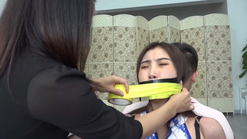李然用手机给情侣二人拍照,还故意拿给他们看进行羞辱,愤怒的情侣二人瞪向李然这个可恶的坏女人,李然一看,还敢瞪我,把你们眼睛封起来,于是她拿黄色胶带和紫色自粘绷带缠绕在情侣二人眼睛外,之后带着抢来的财物笑着扬长而去,留下情侣二人扭动身体在黑暗中呜呜呜闷哼挣扎着,可不管如何挣扎绳索都纹丝未动,最终小两口低下头减小挣扎幅度呜呜闷哼喘息着,保存体力等待救援。