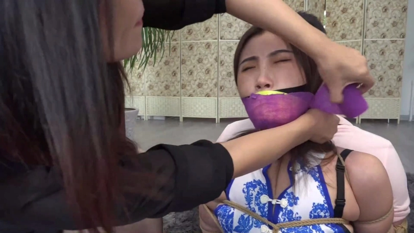 情节:穿青花色旗袍的美女阿琳从昏迷中醒来,吃惊地发现自己被人五花大绑,双腿脚踝并拢捆绑多道,口中被带上塞口球,整个人被紧紧束缚住。