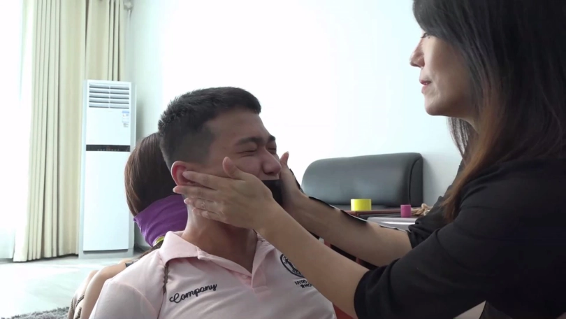 阿琳坐在沙发上拼命挣扎,可始终无济于事,过一会儿阿琳的男朋友回家,看见女友受辱立刻上前想给她松绑解开,可没想到李然从身后偷袭,把阿琳男友迷晕了,很快阿琳男友也跟阿琳一样五花大绑,而且情侣二人还背靠背连缚捆在一起。