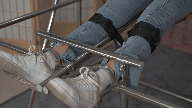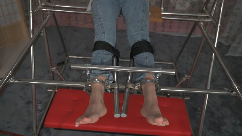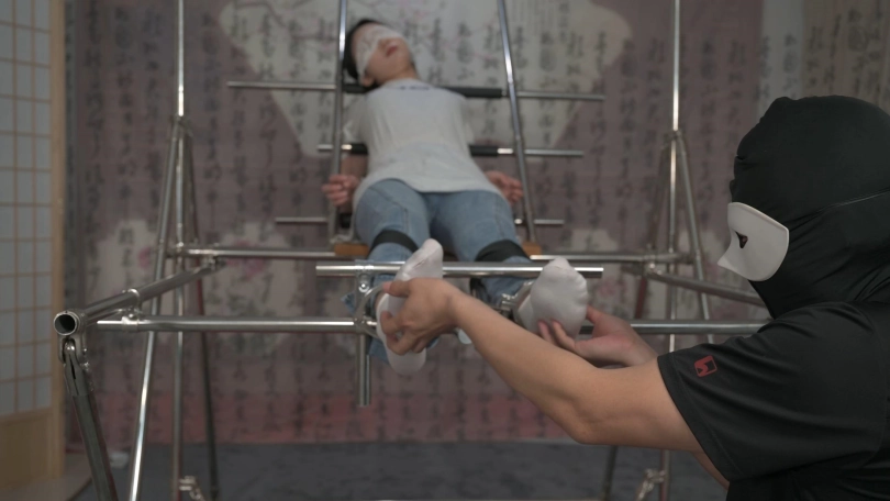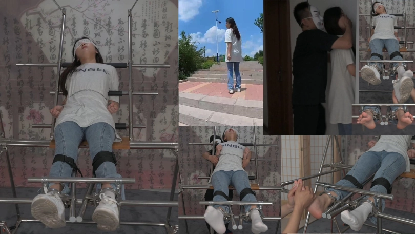 美女小黛在户外跑步,被人盯上,一路尾随到了小区,歹徒好像已经盯了很久了,他提前埋伏到楼道里,等小黛刚打开门的时候劫持了她,并把她带到早已设计好的刑房。小黛被固定住一动不能动,原来歹徒是要玩弄她刚刚运动完的棉袜美脚,他脱去小黛运动鞋,欣赏着她的美脚,接着不停地挠她的脚底、腋下,小黛无助的挣扎喊叫,直到被折磨的精疲力尽软软躺在刑架上。