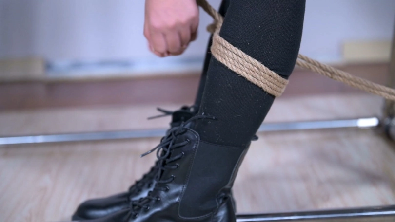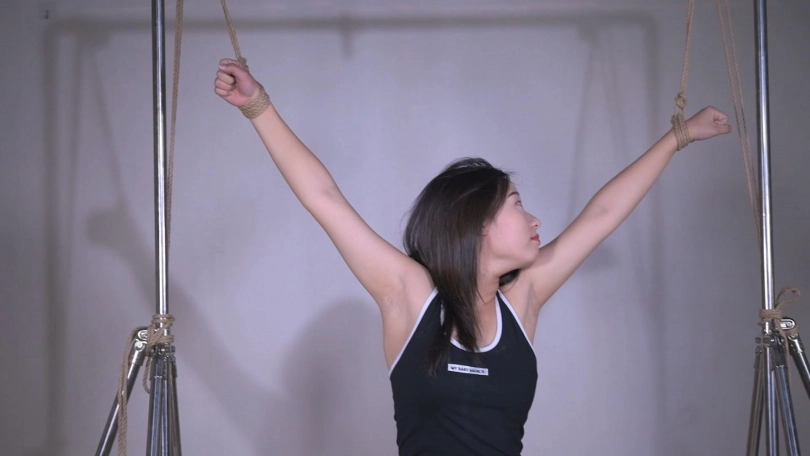 过膝棉袜与短裙之间的部位,日本人称为绝对领域,利用架子给这个部位加一道绳缚,更添一分拘束固定感。另外一个股绳吊臀,可以让绳模有一种进退两难的感受。