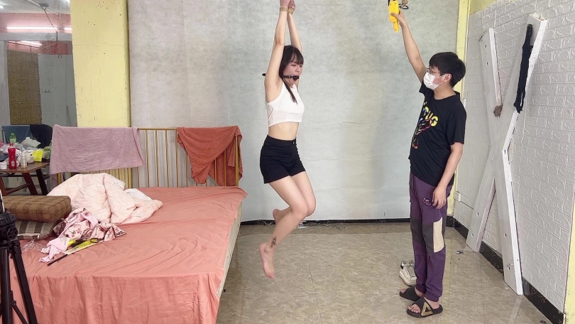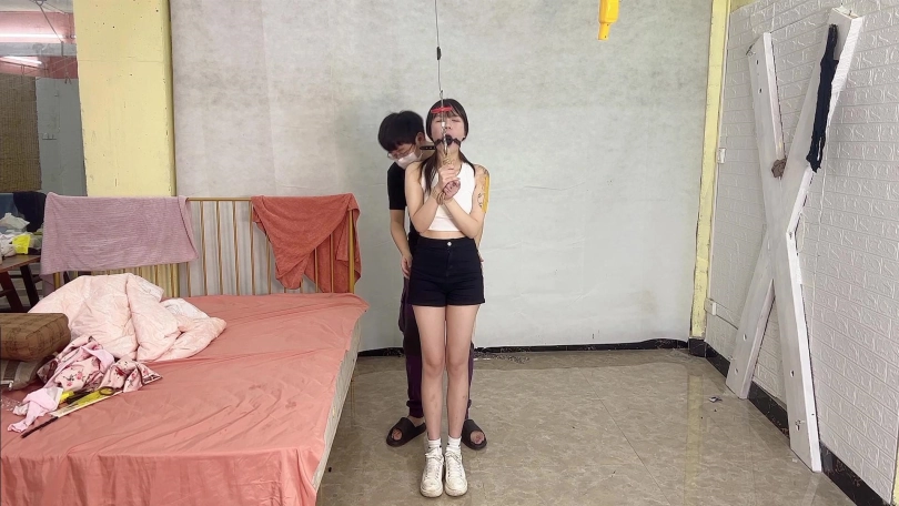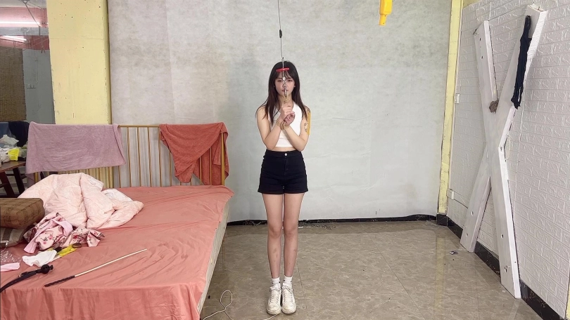 这么漂亮的美女(可可),被吊挂在半空,嘴里含着又大又黑的球,手都乌了。口水直流,难受的表情楚楚可怜。