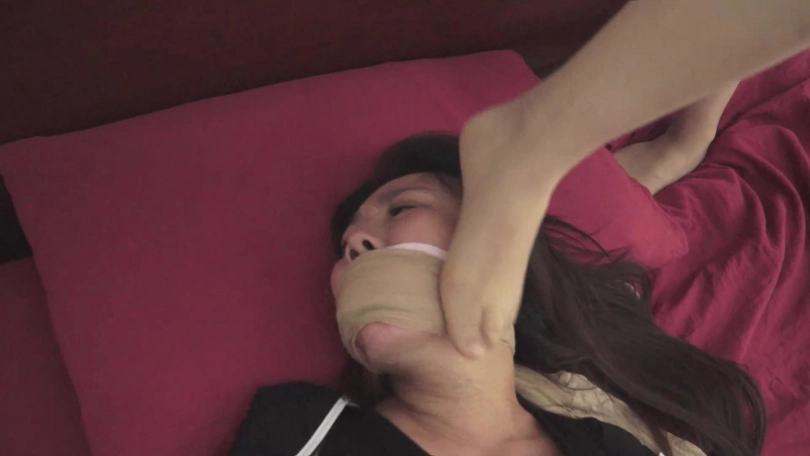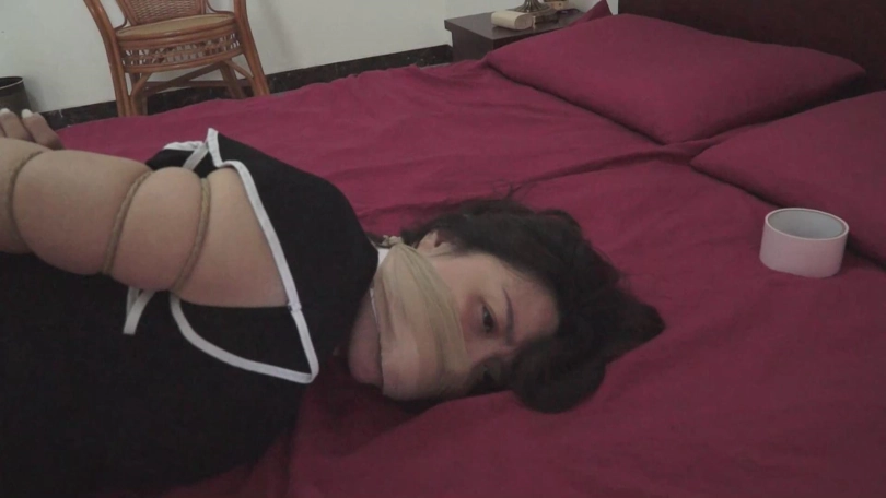 (刘倩拿起刚才捆绑自己的绳子,将曹凤五花大绑,脱掉了曹凤的高跟鞋将其捆成驷马,又脱下自己的白色丝袜掰开曹凤的嘴塞了进去,又拿出家里的透明胶带在曹凤嘴上缠了几圈,又顺手拿起一双丝袜蒙住曹凤的口鼻,一切妥当过后慢条斯理的坐在床边换上另一条丝袜,换完的时候,曹凤也醒了过来!)