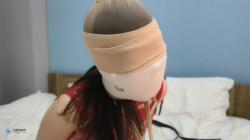 妹子上身穿了一件红色PU服,橙色的丝袜。后手捆绑好,在连接脚捆绑,绑成团缚。嘴里塞进丝袜,外面用胶带封住,再用一双连裤袜套在她的头上,这并不算完,再用绷带缠绕她的口鼻,蒙住她的眼睛。然后开始挠她的脚底。用快乐棒刺激她的下面,很快她就收不了这强烈的刺激,发出高超的呻吟。。。