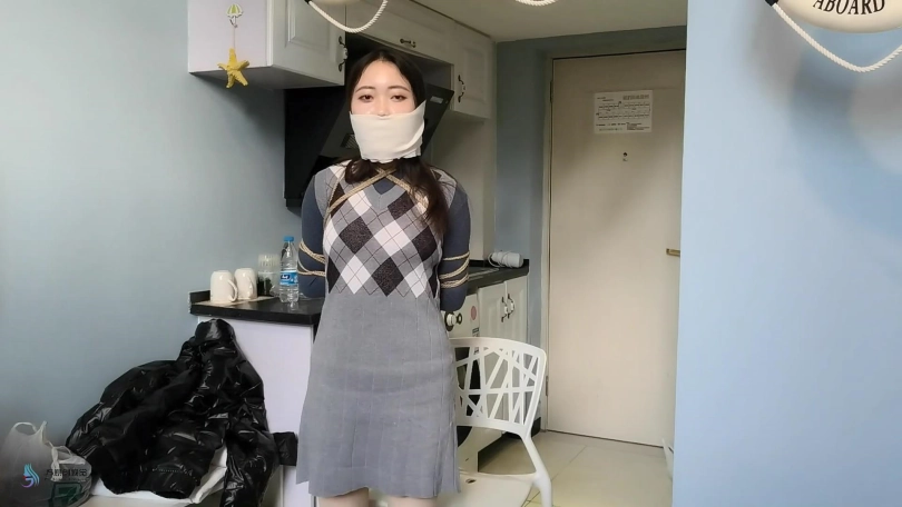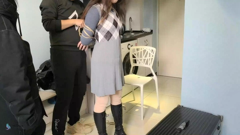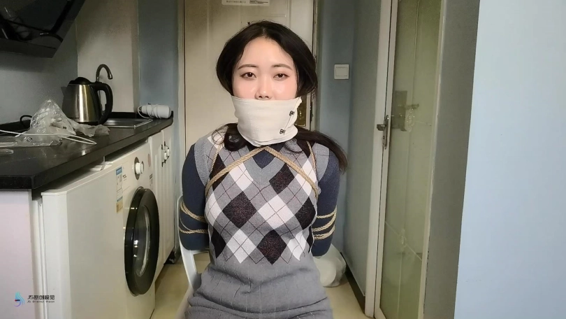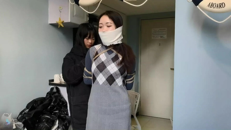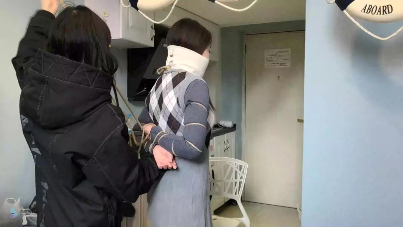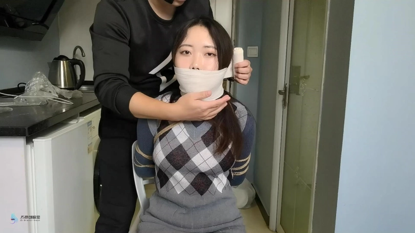 捆绑教程的片子。首先我采用中式变种捆绑将“七穗”捆绑起来。然后让“激辣”给她松绑。并用同样的方式再重新将“七穗”绑起来。嘴巴也用绷带缠绕。。。