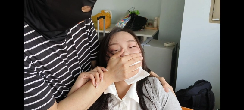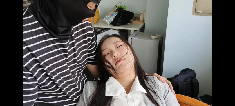 面具男又出来作案了,这次的目标是女秘书哈尼,且看她是如何被面具男迷晕翻白眼后玩丝袜脚的吧。