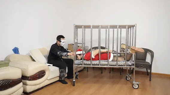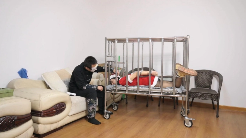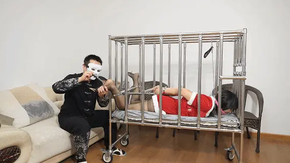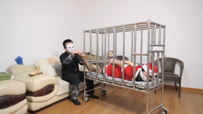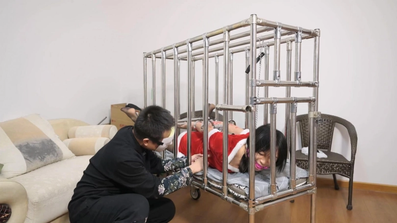 铁架小车升级完工了,还设置了一个“机关”。正值一年一度的圣诞节,圣诞“老人”很有情趣,她悄悄进屋,还特意把礼物找地方藏好,突然就发现了伪装成衣柜的超级小车,这个地方藏礼物不错,当她打开衣柜的瞬间触发了机关。随着男主人把小车推出来,原来这是一座无所不能的铁笼,可以搭建任何刑具,圣诞“老人”已被镣铐牢牢固定在笼子里,这个礼物真不错,就是有点吵,要用丝袜和绷带把嘴巴堵上才能愉快的玩耍,玩弄了一会才发现原来送来的礼物是那个盒子呀,哎呀竟然弄错了,打开盒子还有惊喜。最后再用项圈把圣诞“老人”的头强制抬高,好好欣赏把玩,既来之则玩之,好开心的圣诞节!