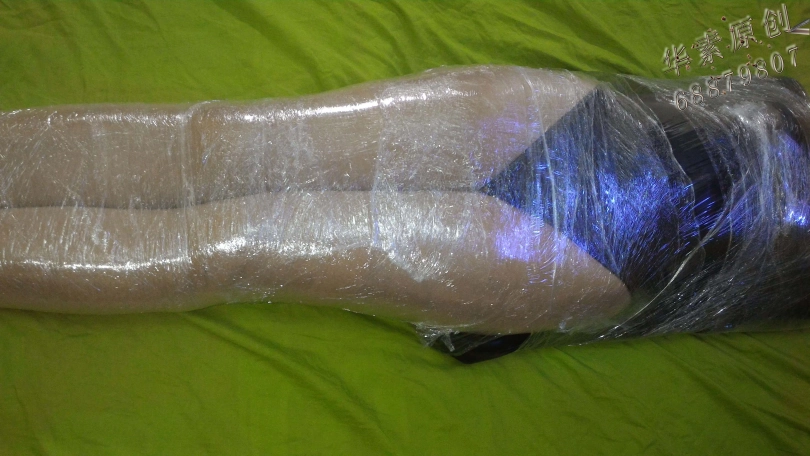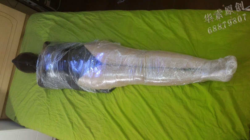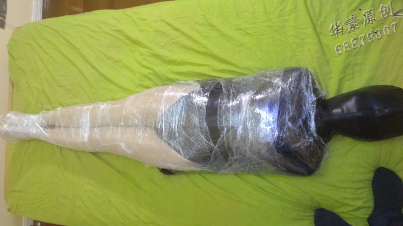美女穿上亮舍宾裤袜,全包拘束服后,动作受到限制,然后被保鲜膜层层全包,最后头部包裹窒息受不了。