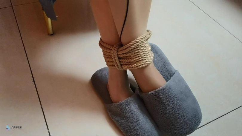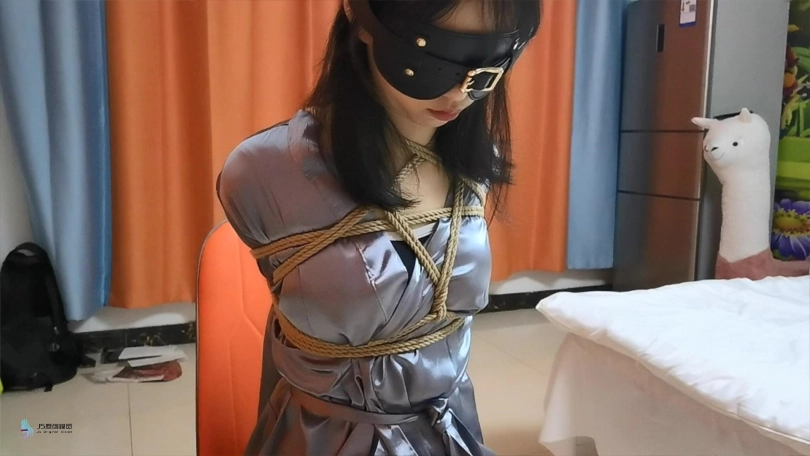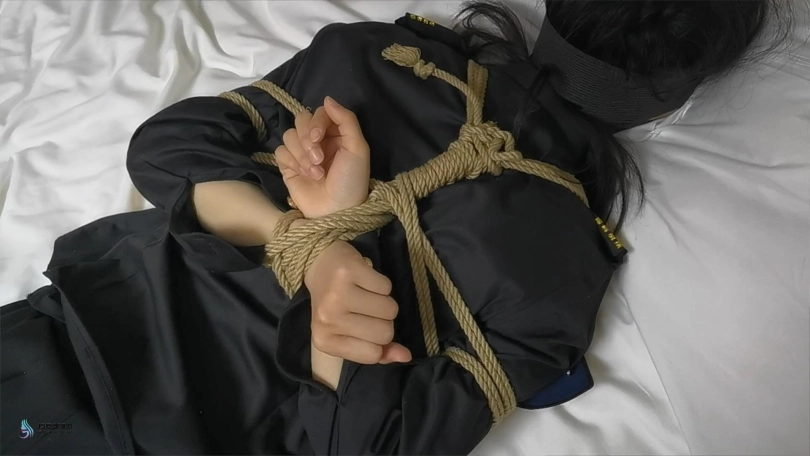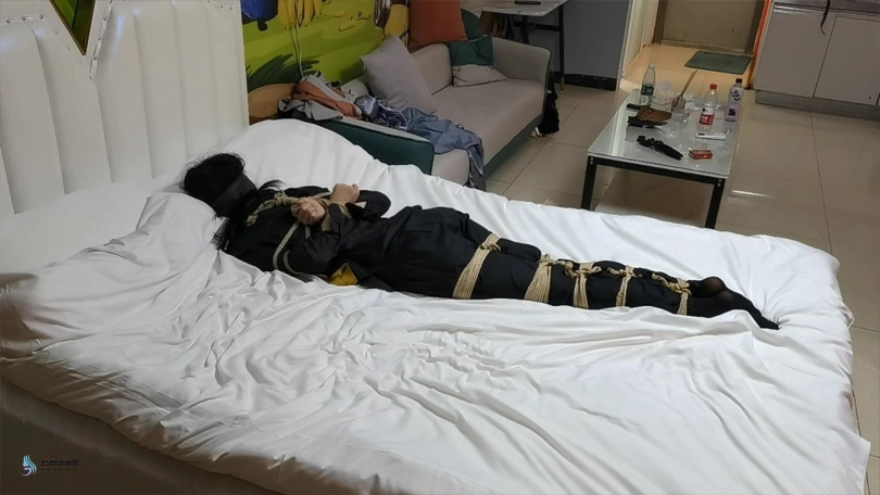 绑法:后⾼⼿,腿被膝盖上下、脚腕三处绳⼦并排绑,胶布蒙眼堵嘴