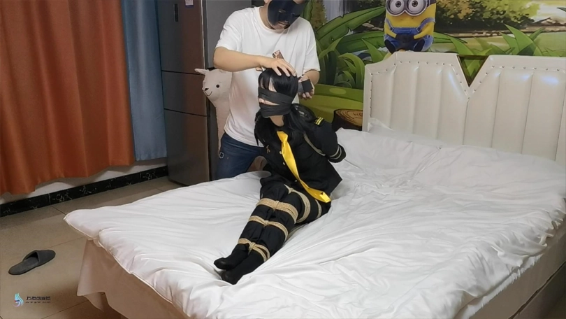 镜头⼀转,⼥主还是安静地坐在原来的凳⼦上,只不过以⼀个不同的姿势。她的双臂被牢牢固定在身后,腿被绳索固定成了⼀个⼆郎腿的姿势。⼥主的眼睛已经被眼罩蒙上,惊恐愤怒的她还在质问⽍徒:“混蛋,你到底想要⼲什么?”话还没说完,⼥主的嘴巴就被⼝球赌上。⼥主拼命扭动身体挣扎。⽼⿊将其拖鞋脱下,玩弄其脚掌。