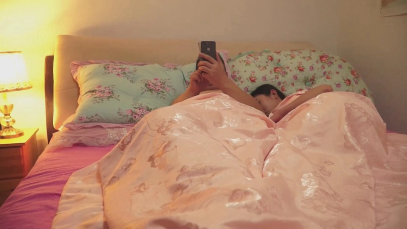 终于两人都累了,王力和小晗盖着 被子,小晗侧身已经睡去,地上散落着金属拘束工具,王力在玩着手机微信。