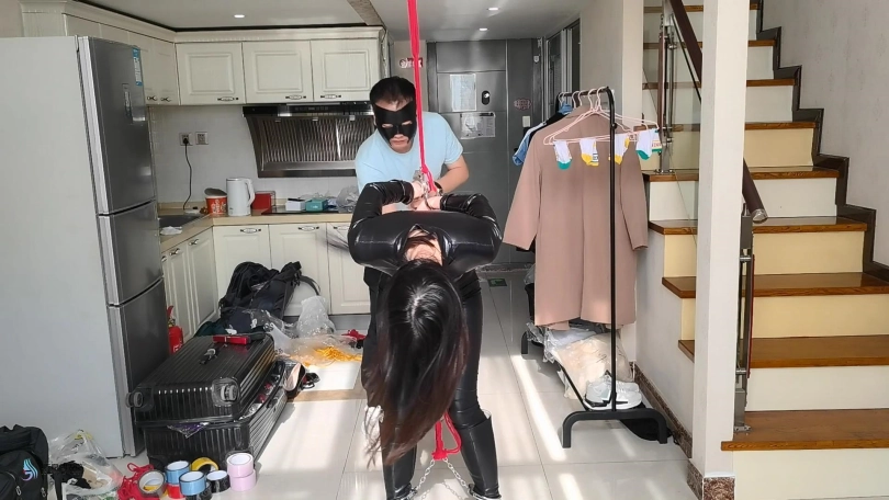 人贩再次询问她,但诗彤还是拒绝回答。愤怒的人贩决定将她TJ好后贩卖。男人用一团布塞进她的嘴巴里,外面用胶带封住,防止她吐出来。用绳子将双手反吊起来,脖子上也拴着绳子,并向下拉和脚上的镣铐绑在一起。这样诗彤只能弯腰低头,将屁股高高的抬起。男人不断的用鞭子抽打着她,然后将她放置在那里,任由诗彤痛苦的挣扎着。