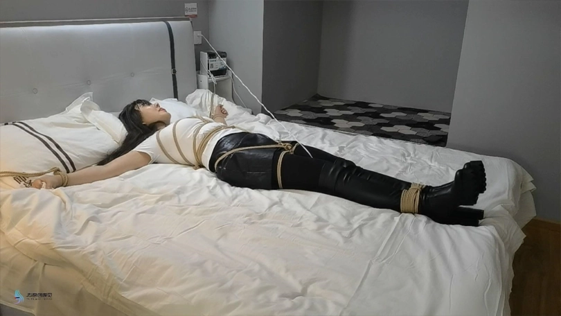 房东重新模特的腿捆在一起,开始对着模特身上就是一顿摸胸,手指慢慢拂过模特的[X_X]。模特忍不住发出了性感的声音。模特双腿不断挣扎,但怎么挣扎都比不过房东的力气。房东玩爽了之后模特用尽自己的力量想站起来逃脱,但是鞋跟太高,地板这么滑,模特怎么都站不起来,挣扎了几分钟之后好不容易站起来想一步步逃走,但是高跟鞋的声音让房东给听到了,生气的房东抱着模特把她带到了房间里,他将模特大字缚捆在床上,随后拿来瑜伽棒对着模特就是一顿输出,下面瑜伽棒手上也不闲着,模特无力抵抗。最后房东玩爽了,换了种捆姿,将模特两腿跟着[X_X]绑在一起,只剩下四肢被绑,动弹不得的模特,躺在床上不停地哀嚎……